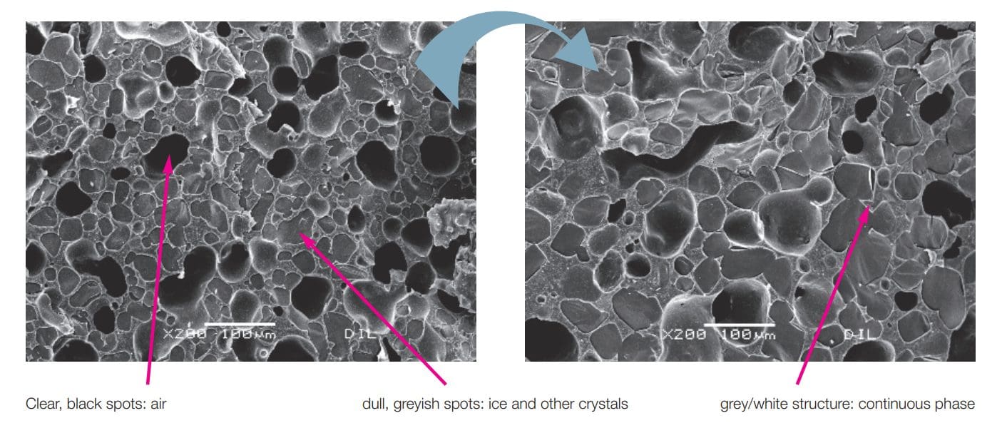 Figure 3 shows the images of the full sugar reference without stabilisers taken with the SEM. The formation of much larger crystals and air cells can be observed in the sample post heat shock. Air phase instability leads to coalescence of the air cells and may lead to structural collapse.