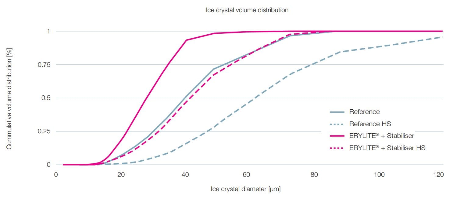 Figure 5 shows a comparison of the results from the heat shock test. The use of erythritol does not have a negative impact on heat shock stability. With the addition of just a small amount of stabiliser, the no sugar added sample with erythritol shows a good ice crystal volume distribution range. Even after heat shock, approximately 83% of the ice crystals are still below 60 µm in size.