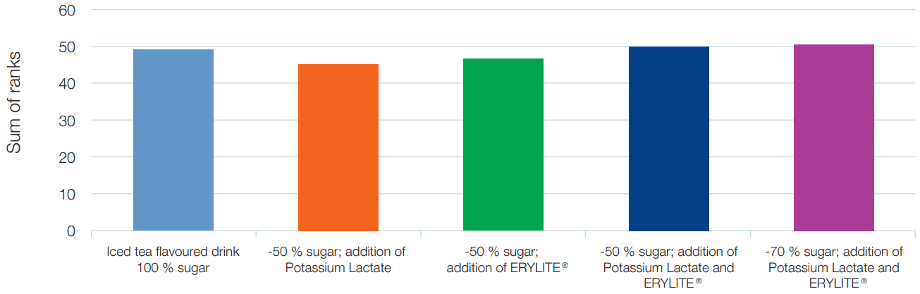 The sensory results indicate that the addition of both ERYLITE® and potassium lactate improves the flavour of an iced tea flavoured drink with 50% less sugar to such an extent that the panel’s preference for this version is only slightly lower than for the full-sugar version. Using both together leads to the desired result: the panel’s preference is the same as for the full-sugar version. What is most interesting is that preference for the drink with 70% less sugar is also the same as for the full-sugar drink. Both products, ERYLITE® as well as potassium lactate, are thus excellent tools for improving the taste and flavour intensity and thus the overall preference of sugar reduced iced tea flavoured drinks, particularly when used in combination.