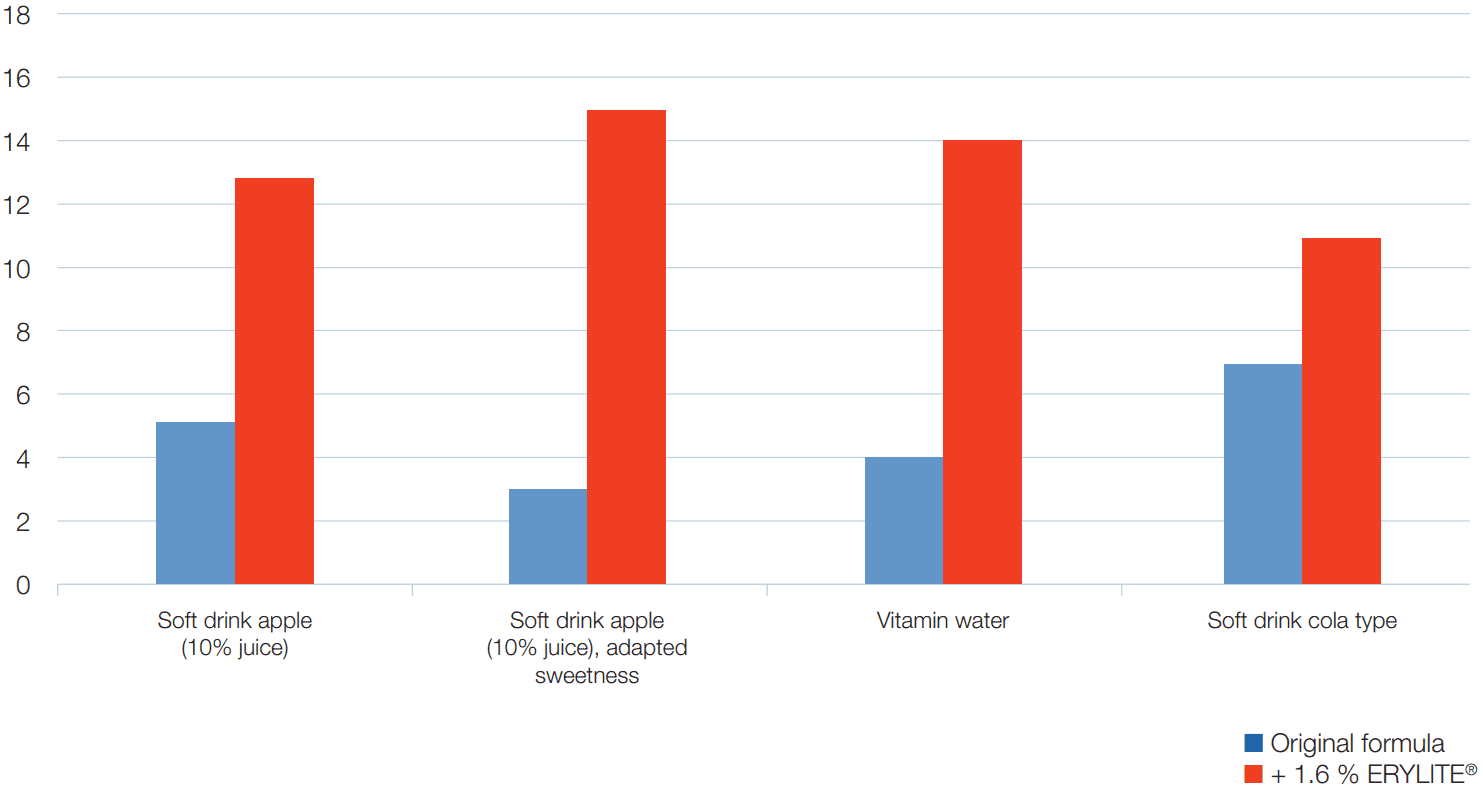 The sensory testing of the four different beverage types reveals a general trend towards a better taste and higher flavour intensity upon addition of 1.6% ERYLITE® to energy-reduced drinks. The effect differs in strength for each type. While the improvement on the cola drink is visible but not extraordinary, it is much stronger for the two apple-flavoured soft drinks and the strawberry/pomegranate-flavoured vitamin water. This is because fruity flavours are better enhanced by ERYLITE®